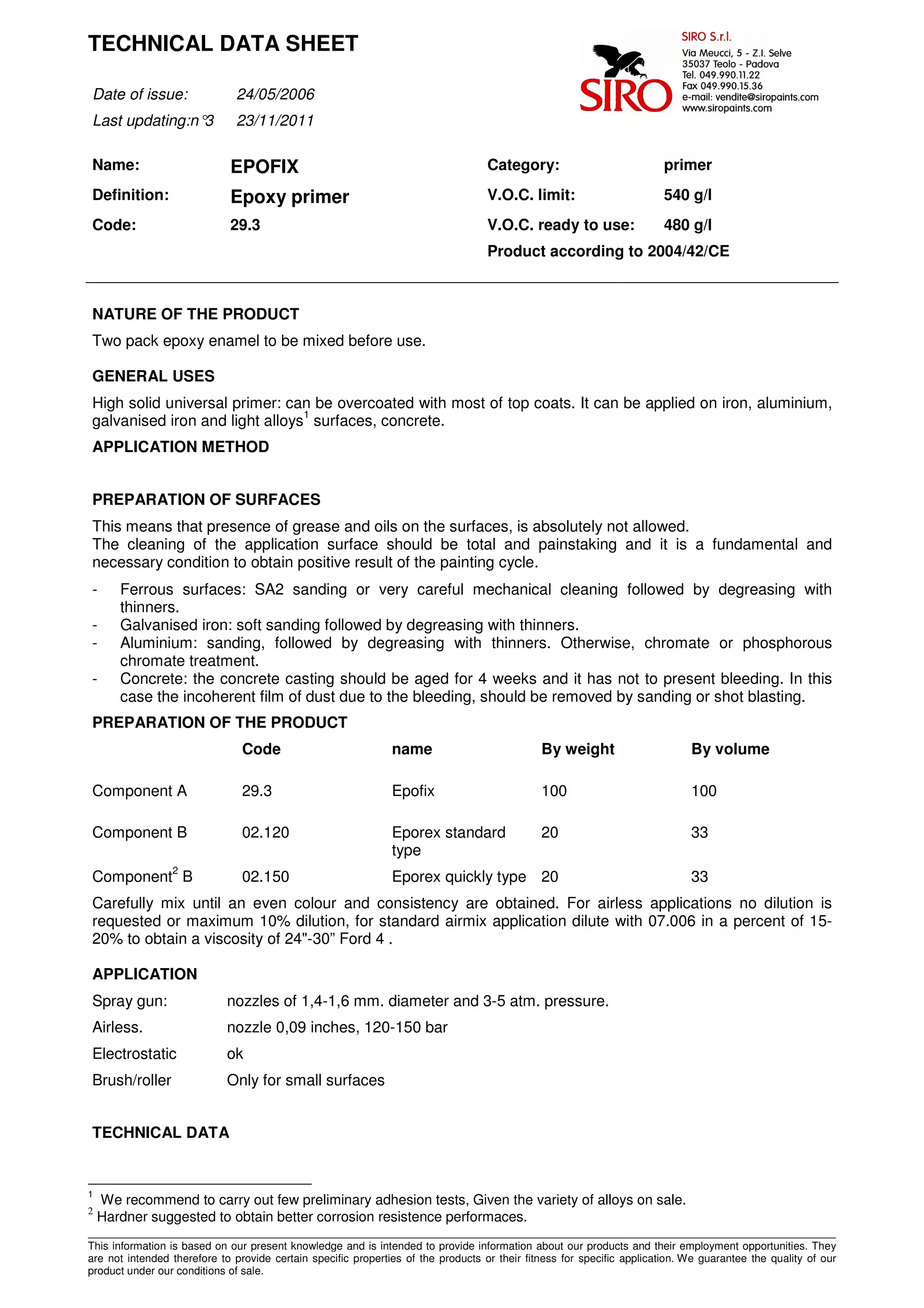 EPOFIX is a two-pack epoxy primer intended for use on iron, aluminum, galvanized iron and light alloys, as well as concrete surfaces. It requires thorough surface preparation through sanding or mechanical cleaning followed by degreasing. The primer consists of Components A and B, which are mixed together prior to application by spray gun, airless sprayer, or by brush/roller for small areas. EPOFIX dries to touch in 4-5 hours at 20°C and achieves full hardness within 24-36 hours. It offers resistance to acids, alkalis and solvents and can be overcoated within 8 hours for optimal adhesion when mixed with Component B.