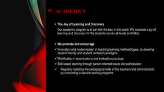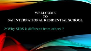 SIRS is a residential school that aims to provide a holistic education through rigorous academics, extracurricular activities, and character development. The school follows the CBSE curriculum but also offers specialized courses to broaden students' knowledge. It uses innovative teaching methods and regularly updates teachers' skills. Beyond the classroom, students participate in music, arts, leadership activities, and sports. The school provides academic support and encourages creativity, critical thinking, and problem-solving skills to prepare students for life outside of school.