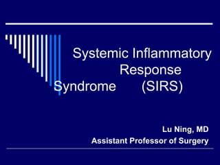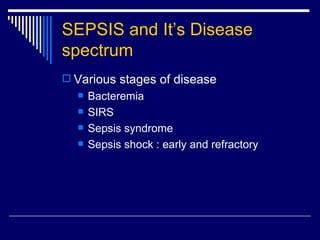 The document discusses systemic inflammatory response syndrome (SIRS) and its relationship to sepsis. It defines SIRS as a systemic response to various stresses and outlines its diagnostic criteria. SIRS can progress to sepsis if an infection is involved. Sepsis is defined as a systemic response to infection along with signs of organ dysfunction. More severe stages include severe sepsis and septic shock. Risk factors, sources of infection, and specific infectious agents associated with sepsis are also reviewed.