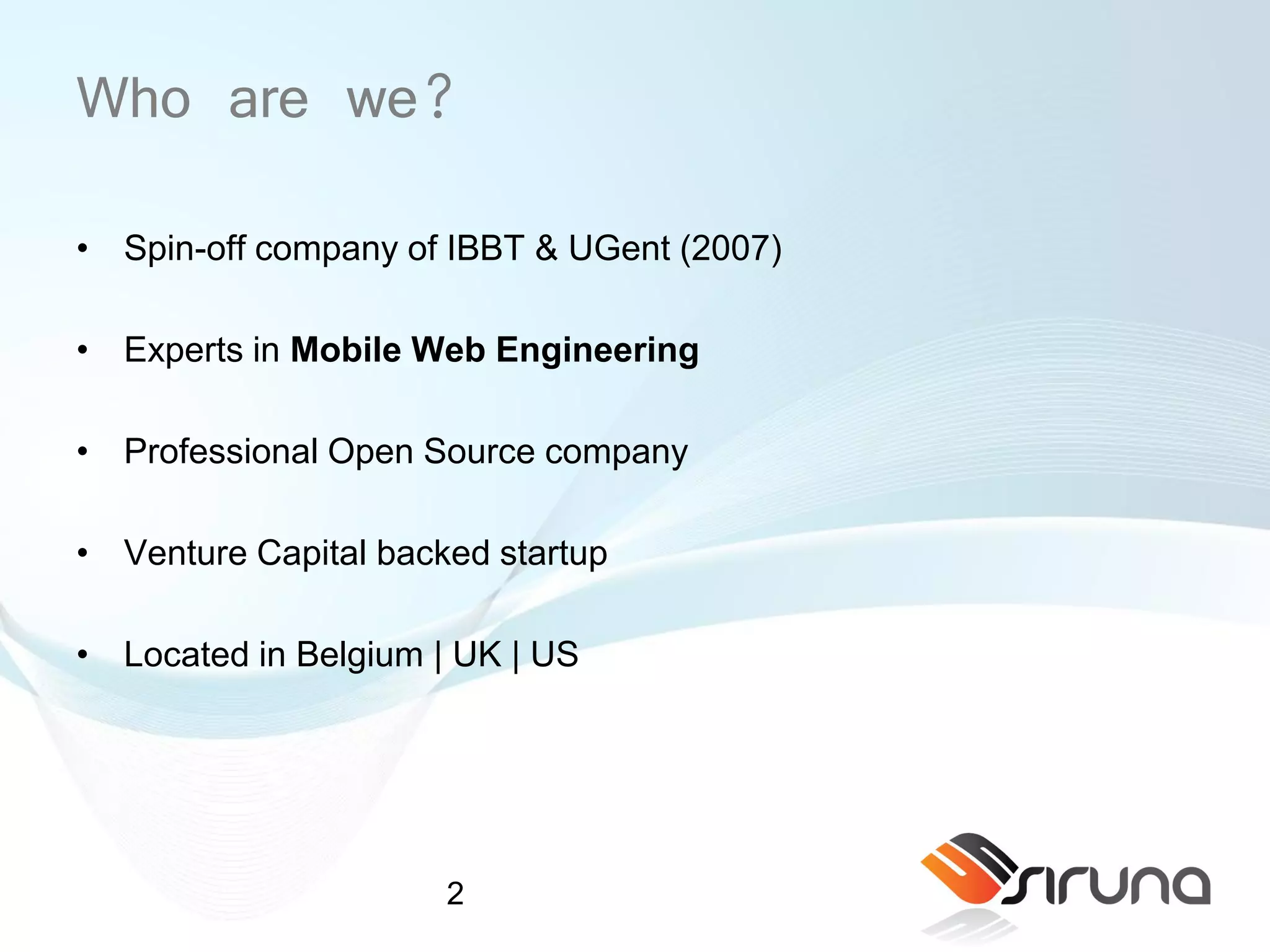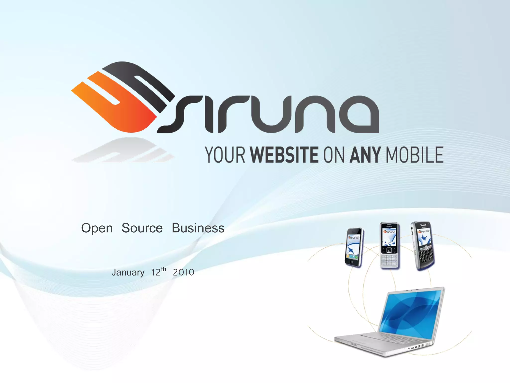 This document discusses Siruna, an open source business that provides mobile web engineering expertise and services. It operates using a dual licensing model, making its open source software available under both a commercial license and an AGPL license. This allows it to commit to open source while also building a sustainable, profitable business. The document outlines Siruna's vision, technology, licensing strategy, and business models for generating revenue from open source software through services, support, consulting and training.