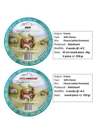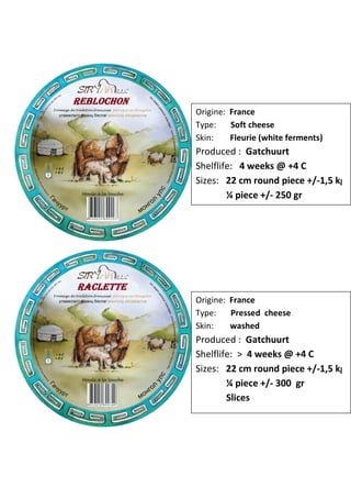 This document contains information about the origin, type, skin, producer, shelf life and sizes of several cheeses. The cheeses are from France, Italy and England and include soft, pressed and hard varieties. They are produced by Gatchuurt and have shelf lives ranging from 1 to more than 6 weeks when stored at 4 degrees Celsius. Sizes vary from round pieces weighing 250 grams to blocks weighing 2.5 kilograms.