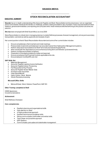 Sisanda Mkiva has over 10 years of experience as a Stock Reconciliation Accountant and Accounts Payable Analyst at Shell South Africa, with responsibilities including performing daily stock reconciliations, ensuring financial controls are followed, and processing invoices. She holds an MBA and has skills in SAP modules including materials management, accounts payable, and hydrocarbon stock. Sisanda is seeking a new opportunity with increased responsibilities and compensation.