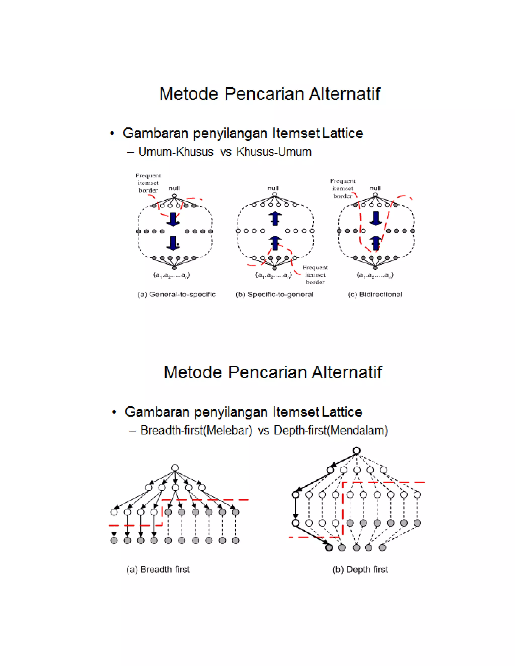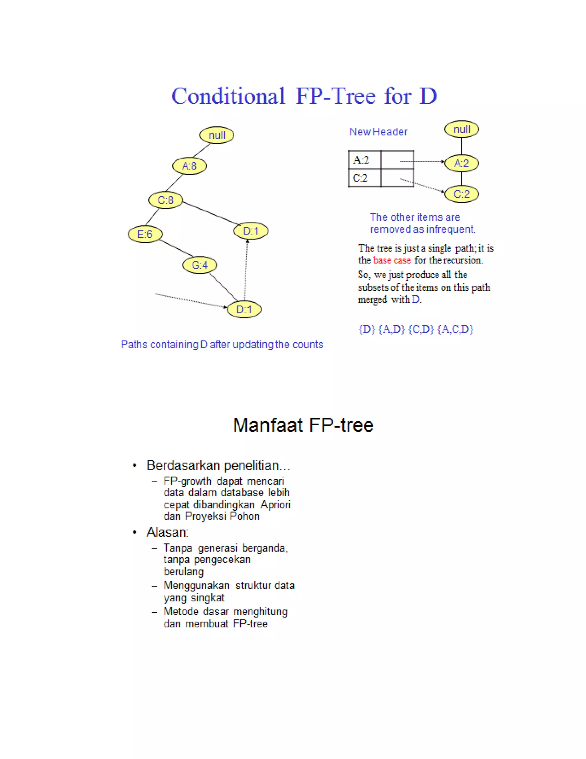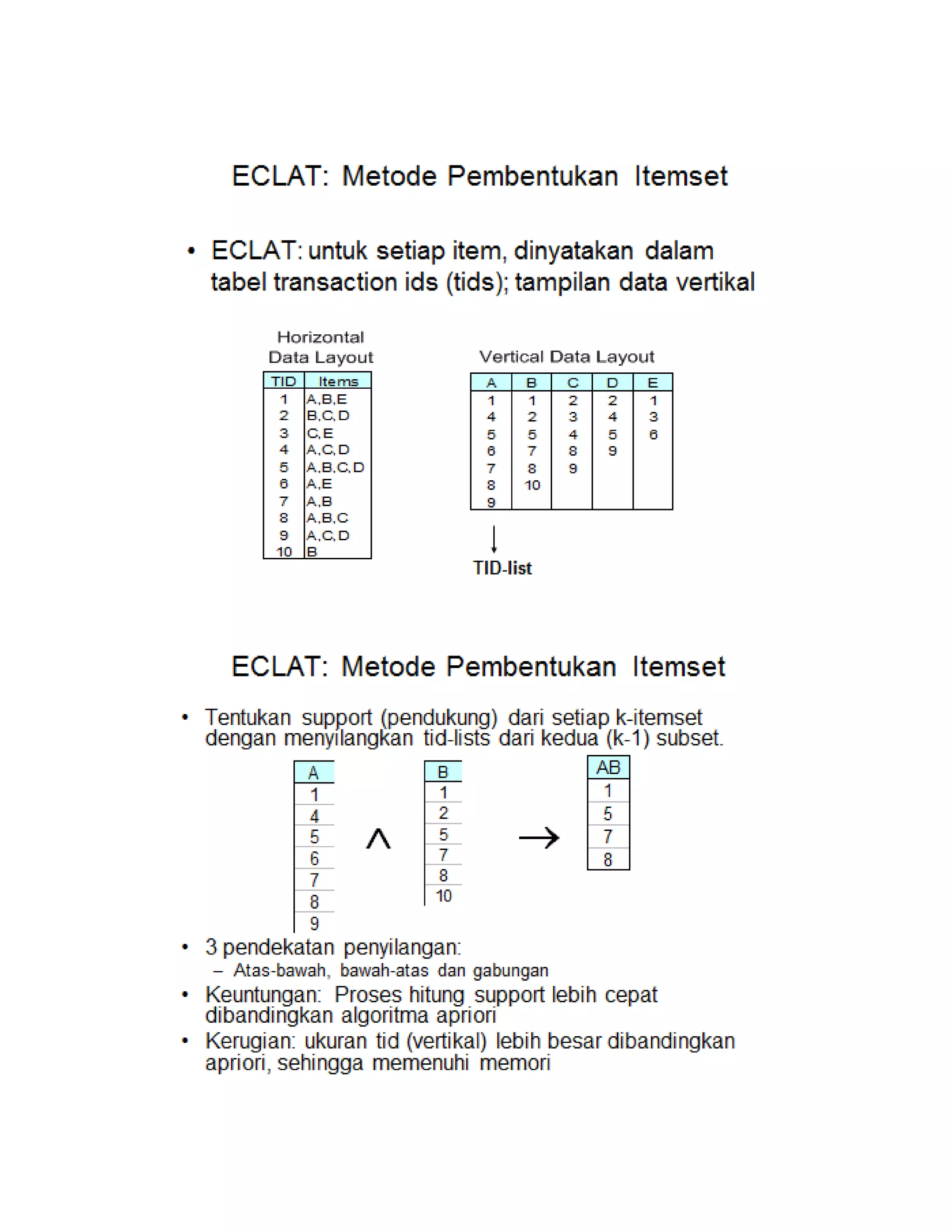 Dokumen tersebut membahas tentang algoritma Eclat dalam menemukan pola asosiasi pada basis data. Algoritma Eclat digunakan untuk mengatasi kelemahan algoritma Apriori yang membutuhkan waktu yang lama karena scanning database berulang kali. Algoritma Eclat bekerja dengan mengkompresi data kedalam struktur pohon FP-Tree untuk menghindari pengulangan scanning database. Frequent itemset diekstrak langsung dari FP-Tree menggunakan prinsip divide