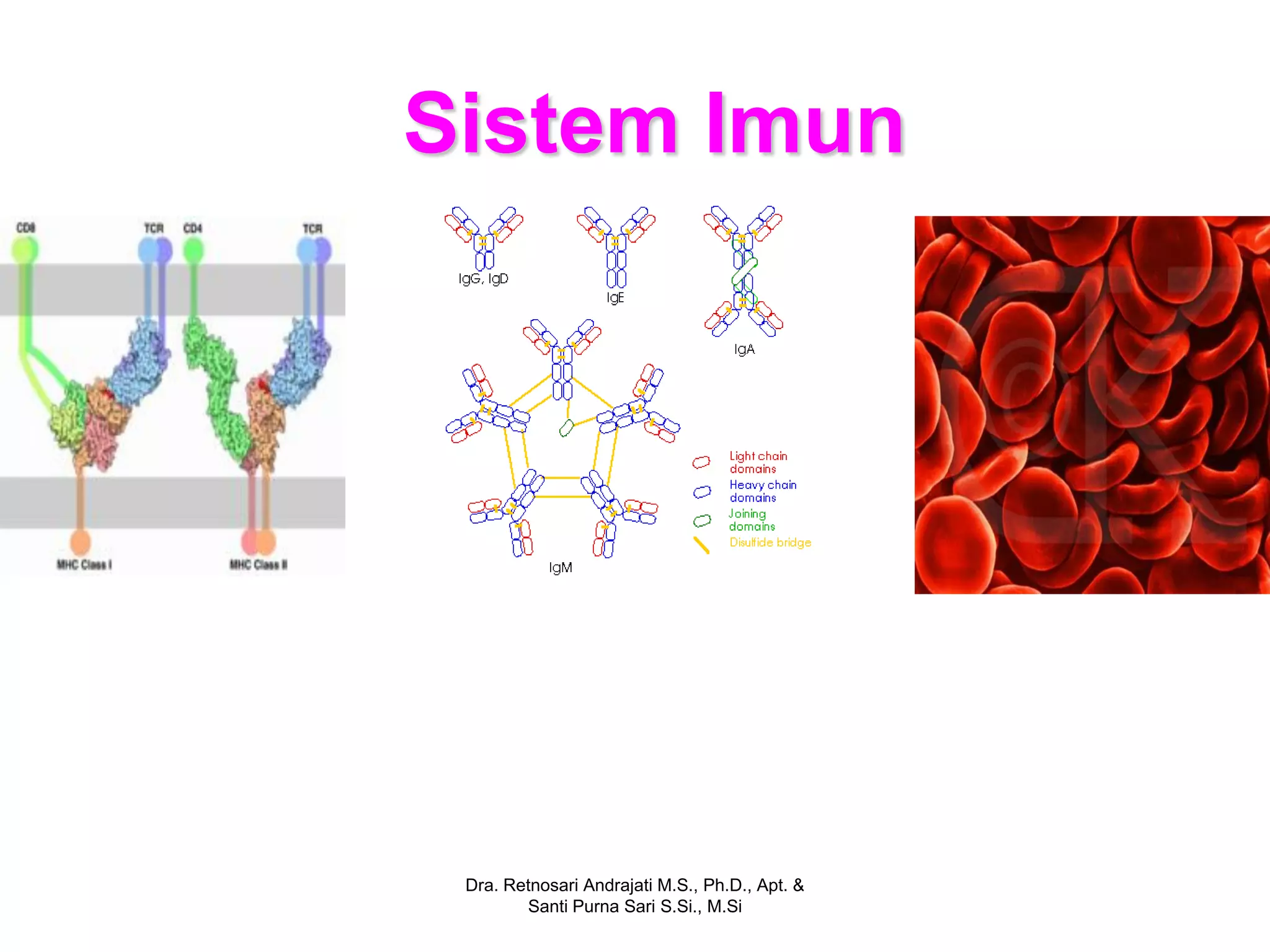 Dokumen ini membahas sistem imun, termasuk mekanisme pertahanan tubuh terhadap patogen dan sel kanker melalui berbagai sel efektor seperti leukosit. Jaringan limfoid berperan penting dalam produksi antibodi dan respons imun yang spesifik serta non spesifik. Respon imun melibatkan proses kompleks yang mencakup pengenalan, penghancuran patogen, dan peningkatan peradangan untuk melindungi tubuh.