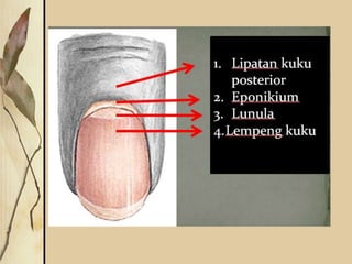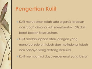 Dokumen ini membahas sistem integumen, yang terdiri dari kulit sebagai organ tubuh terbesar, menguraikan struktur dan fungsi lapisan-lapisan kulit seperti epidermis, dermis, dan subkutan, serta peran berbagai jenis sel di dalamnya. Selain itu, dijelaskan fungsi utama kulit sebagai pelindung, regulator suhu, dan tempat penyimpanan, serta adanya struktur terkait seperti rambut dan kuku. Penjelasan juga menyentuh faktor-faktor yang memengaruhi warna kulit dan ciri-ciri sidik jari yang unik pada setiap individu.