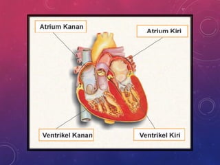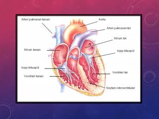 Dokumen ini menerangkan sistem kardiovaskular yang terdiri daripada jantung, arteri, dan vena, serta fungsi utamanya dalam memastikan peredaran darah, pembekalan oksigen, dan penghapusan karbon dioksida. Jantung berfungsi sebagai enjin utama yang mengepam darah ke seluruh badan dan memiliki struktur yang terdiri dari atrium kanan, atrium kiri, ventrikel kanan, dan ventrikel kiri. Pengukuran tekanan darah juga dibincangkan untuk menilai kesihatan kardiovaskular individu.