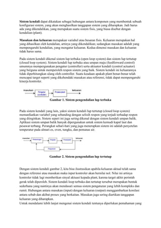 Dokumen tersebut membahas tentang sistem kendali yang terdiri dari dua jenis yaitu sistem kendali lup terbuka dan sistem kendali lup tertutup. Sistem kendali lup terbuka menggunakan kontroler dan aktuator untuk memperoleh respon sistem namun keluarannya tidak diperhitungkan ulang oleh kontroler, sedangkan sistem kendali lup tertutup memanfaatkan variabel yang sebanding dengan selisih respon yang diinginkan dan sering disebut