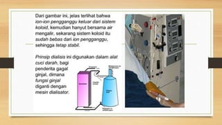 Dokumen ini membahas sistem dispersi koloid, termasuk berbagai jenisnya seperti dispersi kasar, halus, dan koloid serta karakteristik masing-masing. Selain itu, dijelaskan sifat-sifat koloid dan teknik pembuatannya, seperti kondensasi dan dispersi, dengan contoh-contoh aplikatif dalam kehidupan sehari-hari. Metode seperti efek Tyndall, koagulasi, dan elektroforesis juga dibahas untuk menjelaskan perilaku partikel koloid.