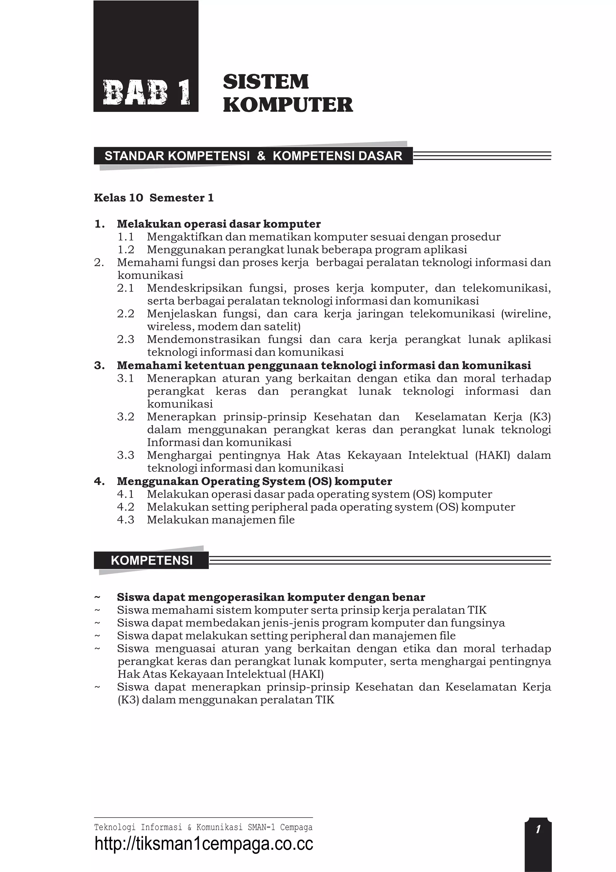 Dokumen ini membahas kompetensi dasar kelas 10 dalam teknologi informasi dan komunikasi, termasuk pengoperasian komputer, pemahaman perangkat keras dan lunak, serta etika penggunaan teknologi. Materi mencakup prosedur mengoperasikan komputer, pengelolaan data, serta pengetahuan tentang berbagai perangkat yang terlibat dalam sistem komputer. Terdapat penjelasan tentang fungsi, jenis, dan cara kerja hardware dan software dalam konteks komputer modern.