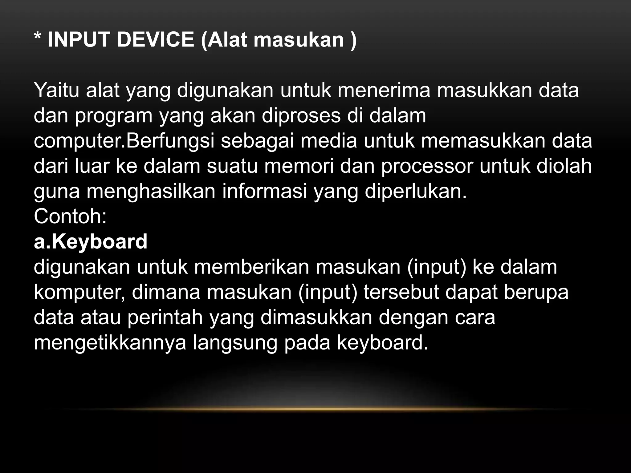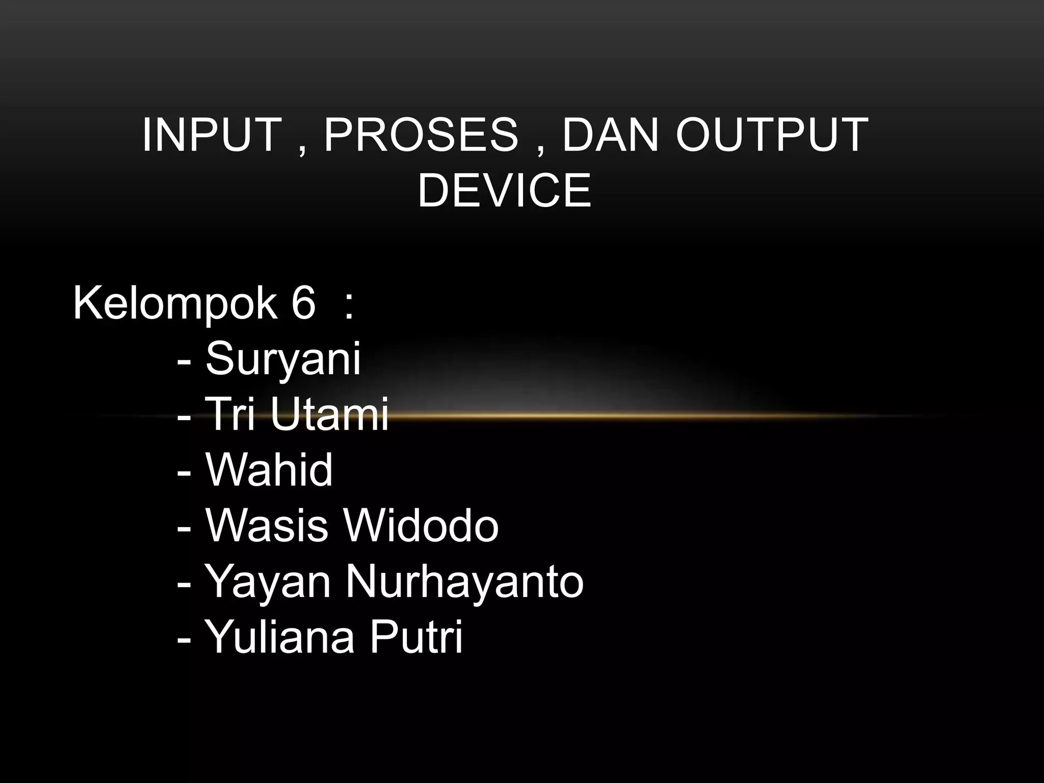 Dokumen ini membahas tentang input, proses, dan output device pada komputer. Input device digunakan untuk memasukkan data ke dalam komputer seperti keyboard, mouse, scanner, light pen, dan barcode. Proses device seperti CPU dan ALU berperan mengolah data. Output device seperti monitor, printer, plotter, dan speaker mengeluarkan hasil olahan data komputer dalam bentuk visual, cetakan, atau suara.