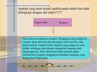 Dokumen tersebut membahas tentang sistem regulasi manusia khususnya alat indra pada manusia. Secara singkat, dibahas tentang lima alat indra utama manusia beserta struktur dan fungsinya, yaitu indra penglihat (mata), indra pendengar (telinga), indra peraba (kulit), indra perasa (lidah), dan indra pembau (hidung).
