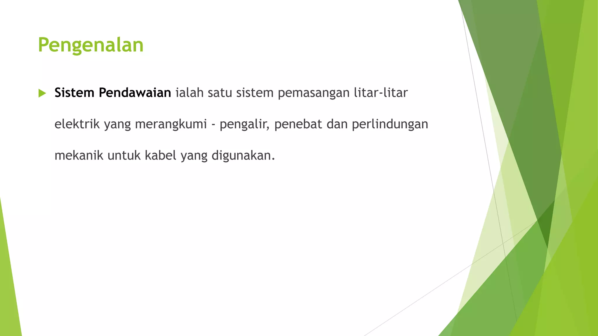 Dokumen ini membincangkan sistem pendawaian domestik di Malaysia, merangkumi jenis beban, keadaan pemasangan, dan jenis voltan bekalan. Terdapat empat jenis sistem pendawaian yang diterangkan: permukaan, pembuluh, tersembunyi, dan sesalur, masing-masing dengan kelebihan dan kelemahan tertentu. Pemilihan sistem pendawaian bergantung kepada faktor seperti jenis bangunan, kos, dan tahap ketahanan yang diperlukan.