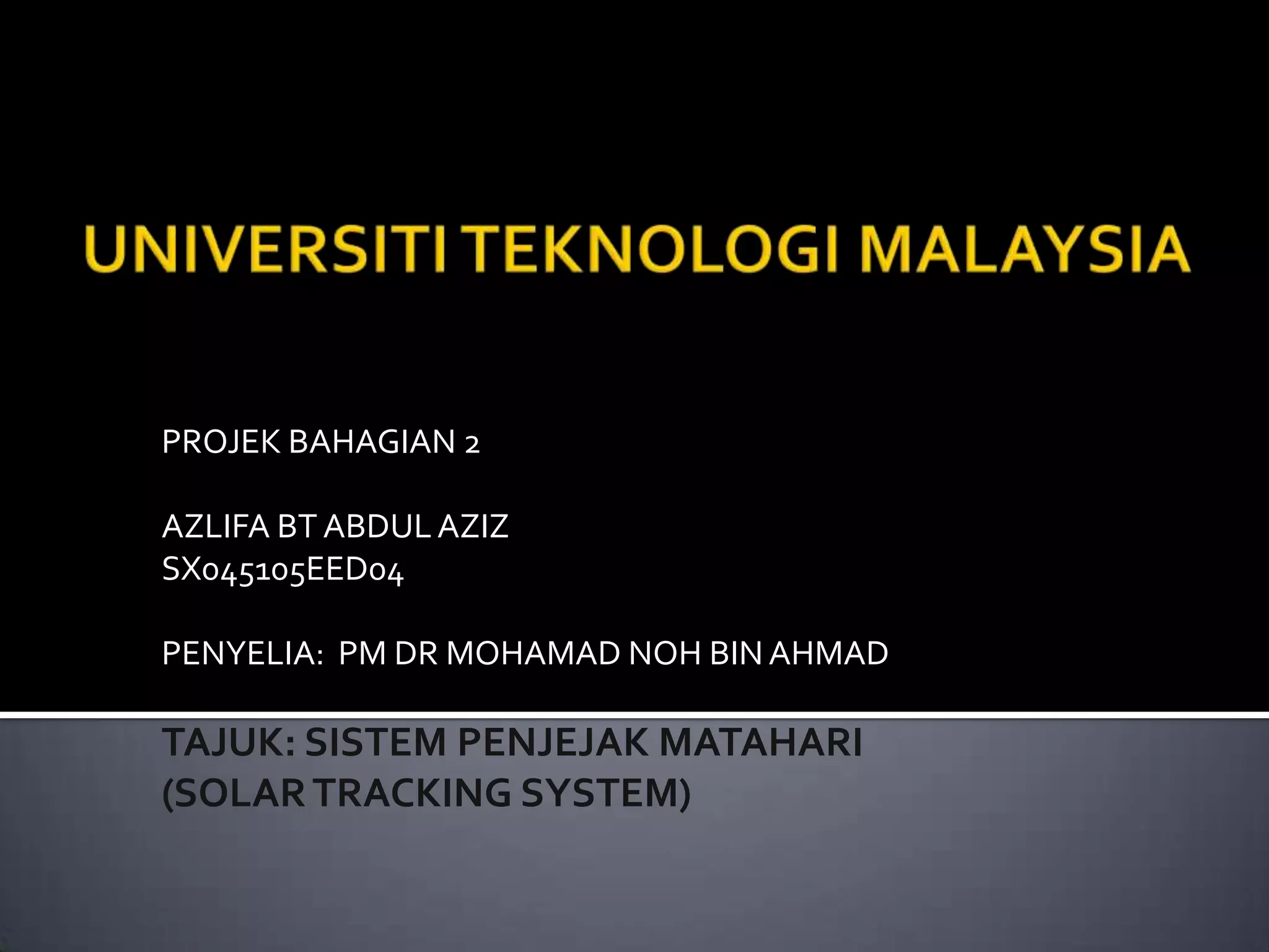 Projek ini membangunkan prototaip sistem penjejak matahari menggunakan motor arus terus dan mikropengawal untuk menggerakkan panel solar mengikut arah matahari. Sistem ini berpotensi meningkatkan kuasa keluaran panel solar berbanding panel statik dan sekali gus memenuhi objektif projek. Penambahbaikan dicadangkan dengan mengaplikasikan penjejak solar 2 paksi untuk meningkatkan kecekapan.
