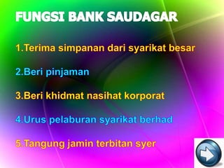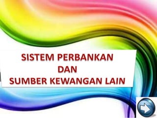 Dokumen ini membincangkan prinsip kewangan Islam, termasuk pengharaman riba dan keperluan untuk mengikuti peraturan Bank Negara Malaysia serta hukum syarak. Ia juga menerangkan pelbagai fungsi bank seperti pengeluaran dan pengawalan mata wang, penyediaan khidmat kepada kerajaan dan bank perdagangan, serta kemudahan pembiayaan dan simpanan. Terdapat juga penjelasan mengenai pajakan, pemfaktoran, dan peranan syarikat jaminan kredit dalam membantu peniaga kecil mendapatkan pinjaman.