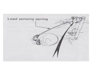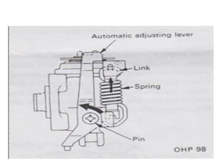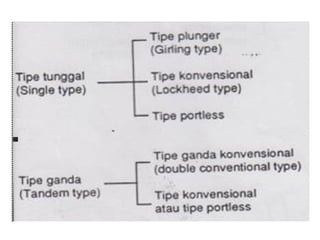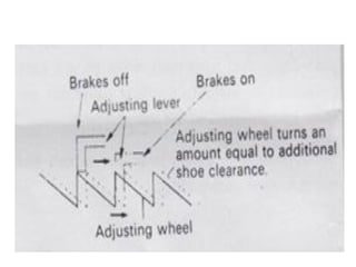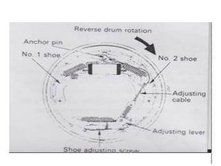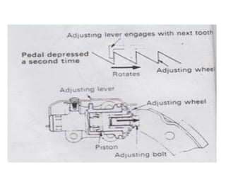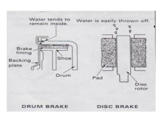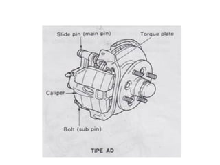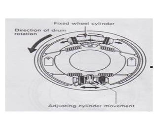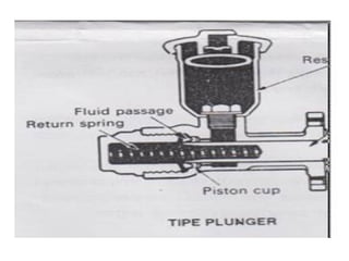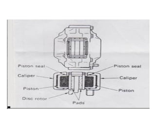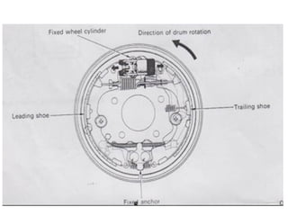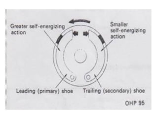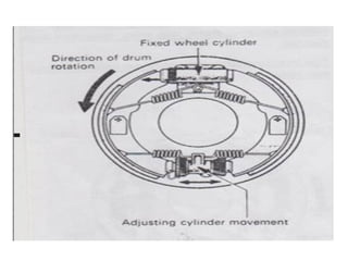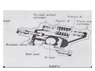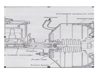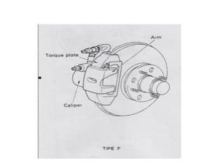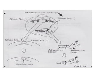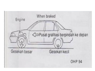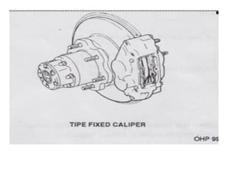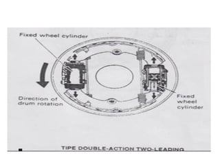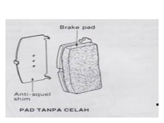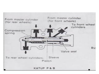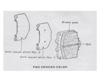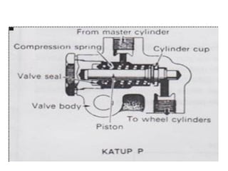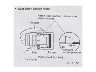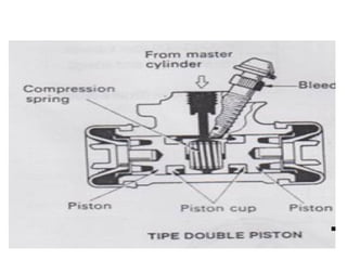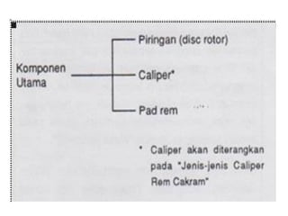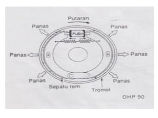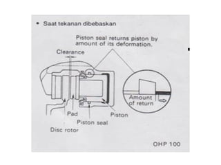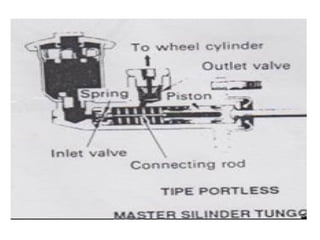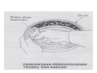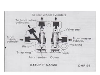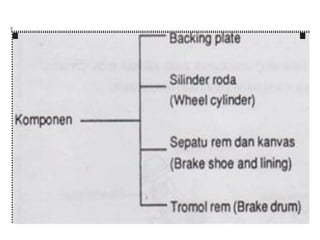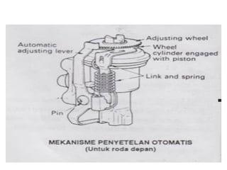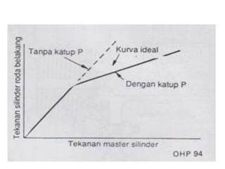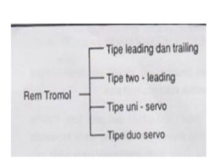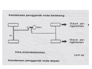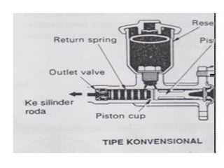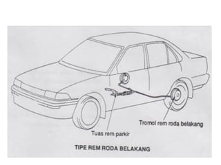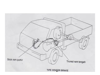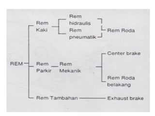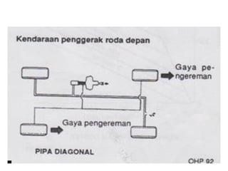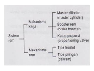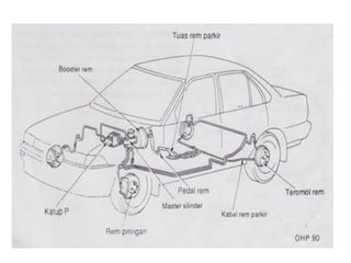 1. Dokumen tersebut membahas tentang sistem rem pada kendaraan, mencakup prinsip kerja, jenis, dan komponen utama rem seperti master silinder, boster rem, katup pengimbang, rem anti-lock, serta rem tromol.