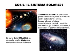 Il sistema solare è un sistema planetario con il sole al centro e comprende otto pianeti, lune, asteroidi e comete, tutti tenuti in orbita dalla gravità. I pianeti si dividono in rocciosi (Mercurio, Venere, Terra, Marte) e gassosi (Giove, Saturno, Urano, Nettuno) e ciascuno ha caratteristiche specifiche. Il sole, una stella nata oltre 5 miliardi di anni fa, è essenziale per la vita sulla Terra e il suo movimento è regolato dalle leggi di Keplero.