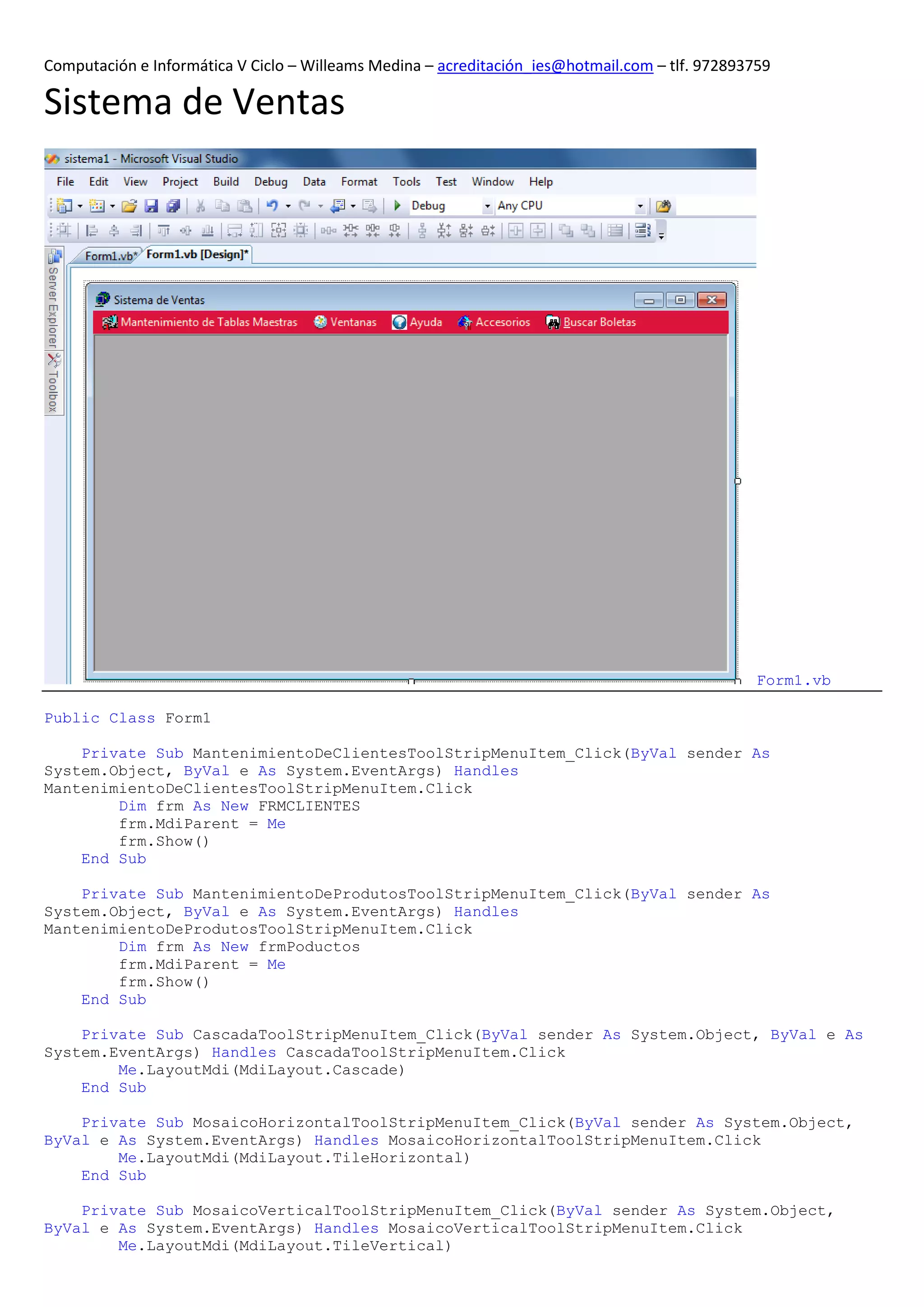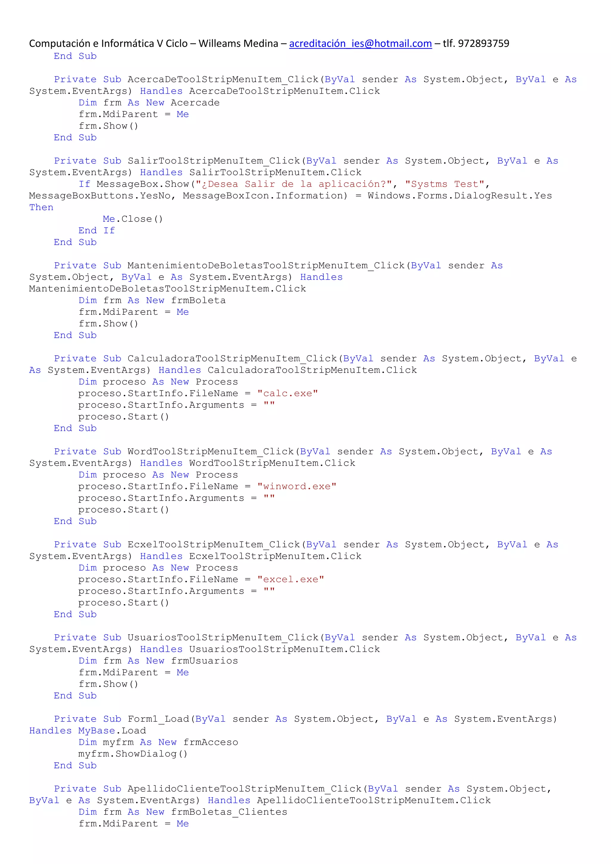 This document contains code for a Visual Basic .NET Windows forms application for a sales system. It includes code to manage clients, products, invoices and users through different forms. It allows layout of multiple document interface (MDI) forms in cascade, horizontal tile and vertical tile. It also includes code to launch external applications like calculator, Word and Excel.