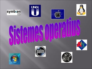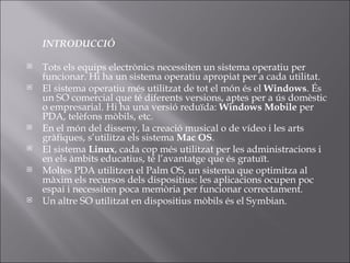 INTRODUCCIÓ Tots elsequips electrònics necessiten un sistema operatiu per funcionar. Hi ha un sistema operatiu apropiat per a cada utilitat. El sistema operatiu més utilitzat de tot el món és el Windows . És un SO comercial que té diferents versions, aptes per a ús domèstic o empresarial. Hi ha una versió reduïda: Windows Mobile per PDA, telèfons mòbils, etc. En el món del disseny, la creació musical o de vídeo i les arts gràfiques, s’utilitza els sistema Mac OS . El sistema Linux , cada cop més utilitzat per les administracions i en els àmbits educatius, té l’avantatge que és gratuït. Moltes PDA utilitzen el Palm OS, un sistema que optimitza al màxim els recursos dels dispositius: les aplicacions ocupen poc espai i necessiten poca memòria per funcionar correctament. Un altre SO utilitzat en dispositius mòbils és el Symbian.