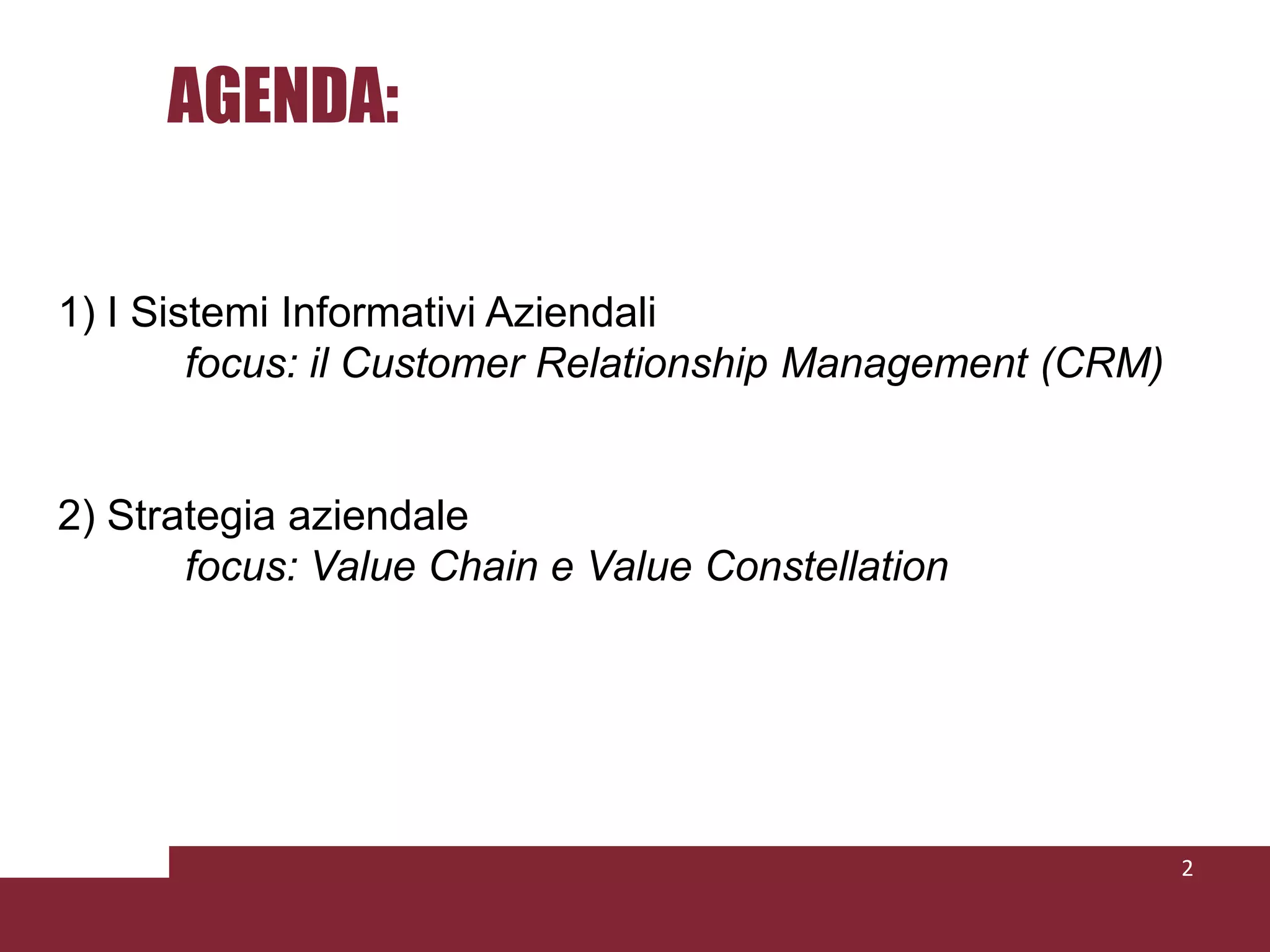 Il documento esplora l'importanza dei sistemi informativi aziendali e del Customer Relationship Management (CRM) per massimizzare le relazioni con i clienti. Viene analizzata la strategia aziendale attraverso la value chain e la value constellation, evidenziando l'interazione con i soggetti esterni per la creazione di valore. Infine, si discute l'importanza della gestione del contact center e delle analisi strategiche per il successo dell'organizzazione.