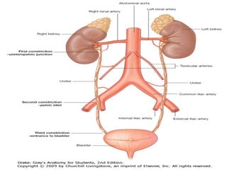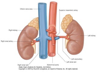 GINJAL Seperti kacang,coklat kemerahan. Organ retroperitoneal, posterior abdomen. Dibungkus kap . jaringan ikat padat dan jaringan lemak perirenal Medial : cekung (hilus) Hilu s dilewati arteri,vena renalis, pembuluh lymph, & ureter Sinus renalis dilewati pelvis, calyx major-minor a. Korteks -> granuler,warna coklat Cortical collums/columna renalis Bertini : kortek s yang menjorok di an ta r a pyramid Lengkungan korteks : korteks di basis setiap pyramid