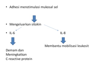 IL-6,IL-8 ikut menginduksiapoptosis epithelial cell Infeksi bakteri menyebabkan hemolysin dan endotoxin,bisa menyebabkan reaksi inflamasi dan bisa berakibat demam,nyeri,dll
