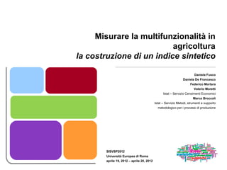 Il documento discute la multifunzionalità in agricoltura, definendola come la capacità delle aziende agricole di produrre beni, sostenere l'ambiente e contribuire alla società rurale. Viene presentato l'obiettivo di misurare il livello di multifunzionalità delle aziende agricole italiane tramite la costruzione di un indice sintetico, basato su indicatori elementari. Inoltre, si illustrano i metodi di calcolo e valutazione, evidenziando strumenti software per l'analisi comparativa degli indici sintetici.