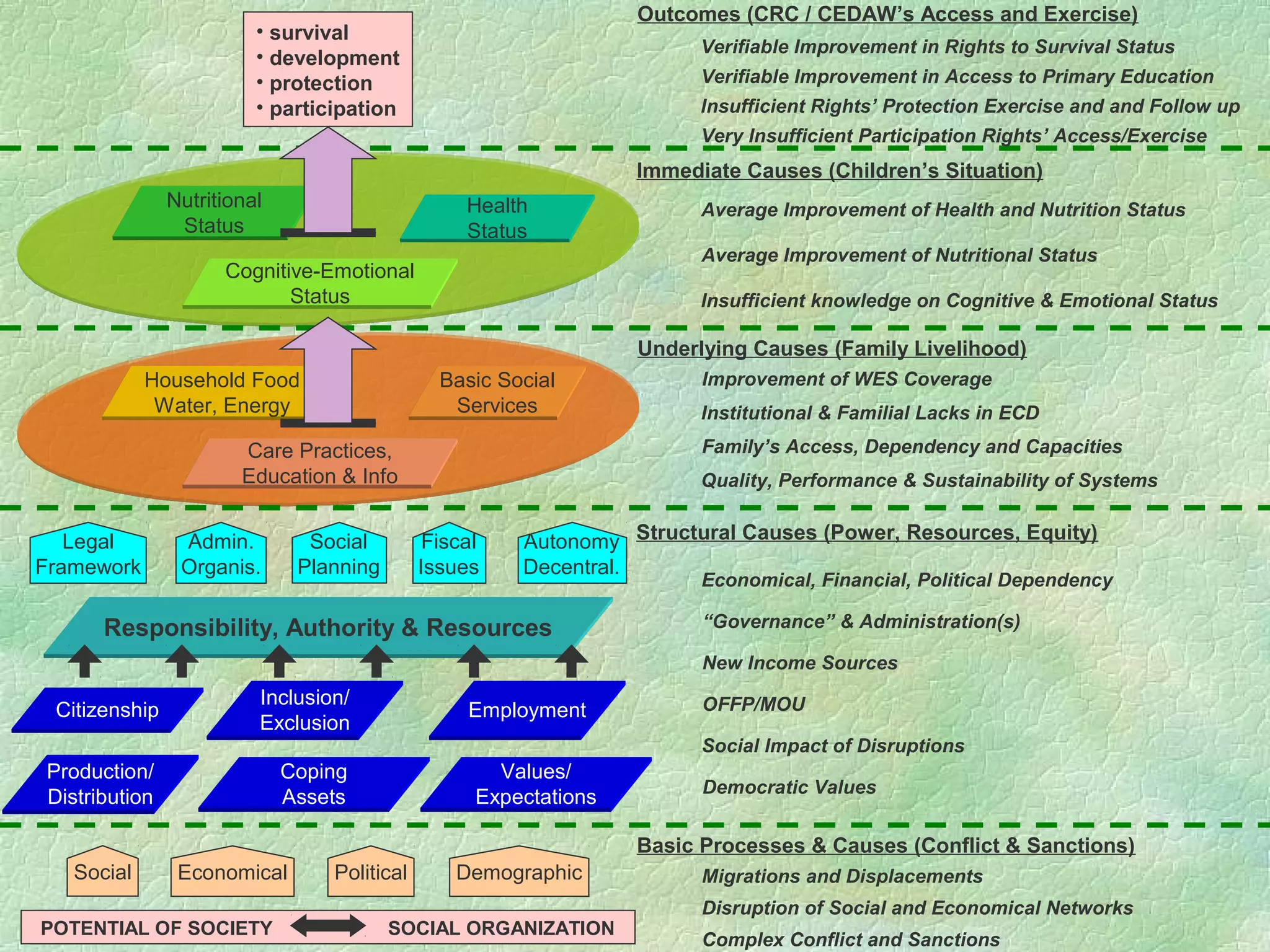 The document discusses factors that impact children's well-being, including their nutritional status, health status, cognitive-emotional status, and access to basic services. It notes that children and families' sustainable livelihoods are threatened by issues like dependence on food rations, loss of assets, and disruptions to social and economic networks. The document also examines challenges facing social systems in the south, such as insufficient social planning, weak institutional capacities, and low qualifications among civil servants.