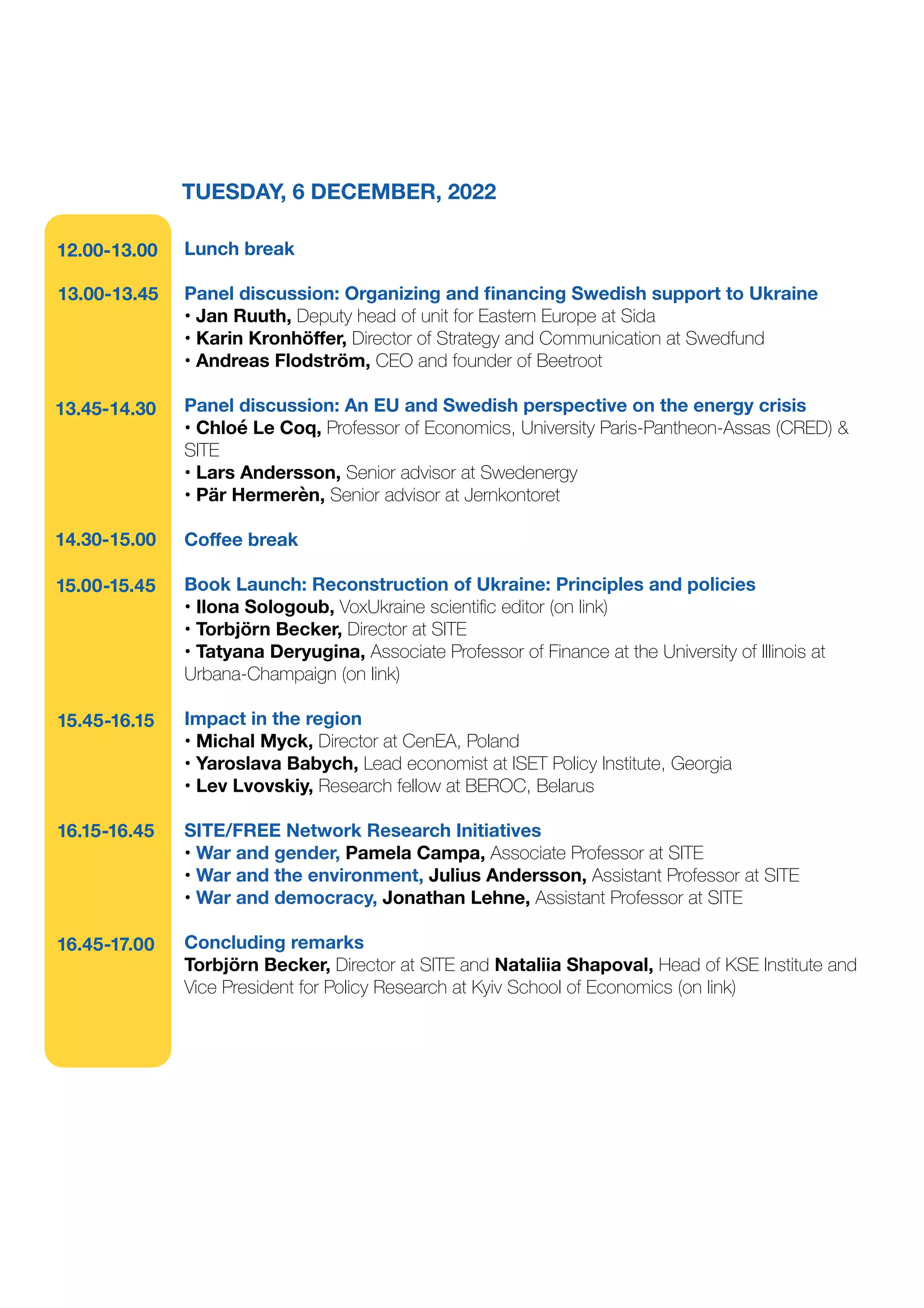 The document outlines the schedule for an event held on December 6, 2022, at the aula at SSE in Stockholm, focusing on support for Ukraine amidst the ongoing war. It includes various speakers from Ukraine, Sweden, and the European Union discussing fiscal policy, energy crises, and post-war reconstruction initiatives. The event features panel discussions, a book launch, and concluding remarks by notable academics and officials.
