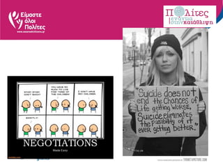 Οι διαφάνειες αυτές ως επί το πλείστον αποτέλεσαν υλικό των τριήμερων εκπαιδευτικών που διοργανώθηκαν στα πλαίσια του προγράμματος "Πολίτες ενάντια στην Κατάθλιψη". Περισσότερες πληροφορίες για το πρόγραμμα μπορείτε να βρείτε στα εξής μέρη: