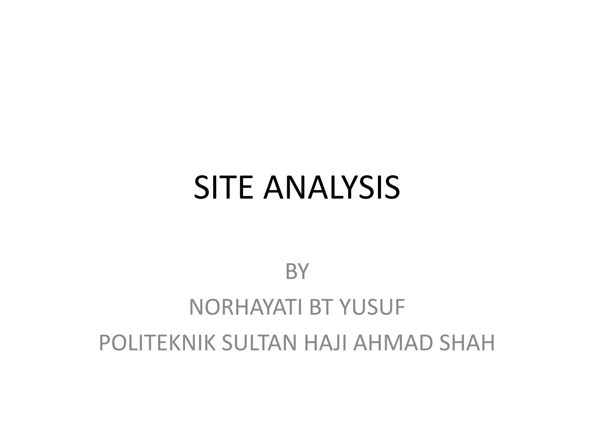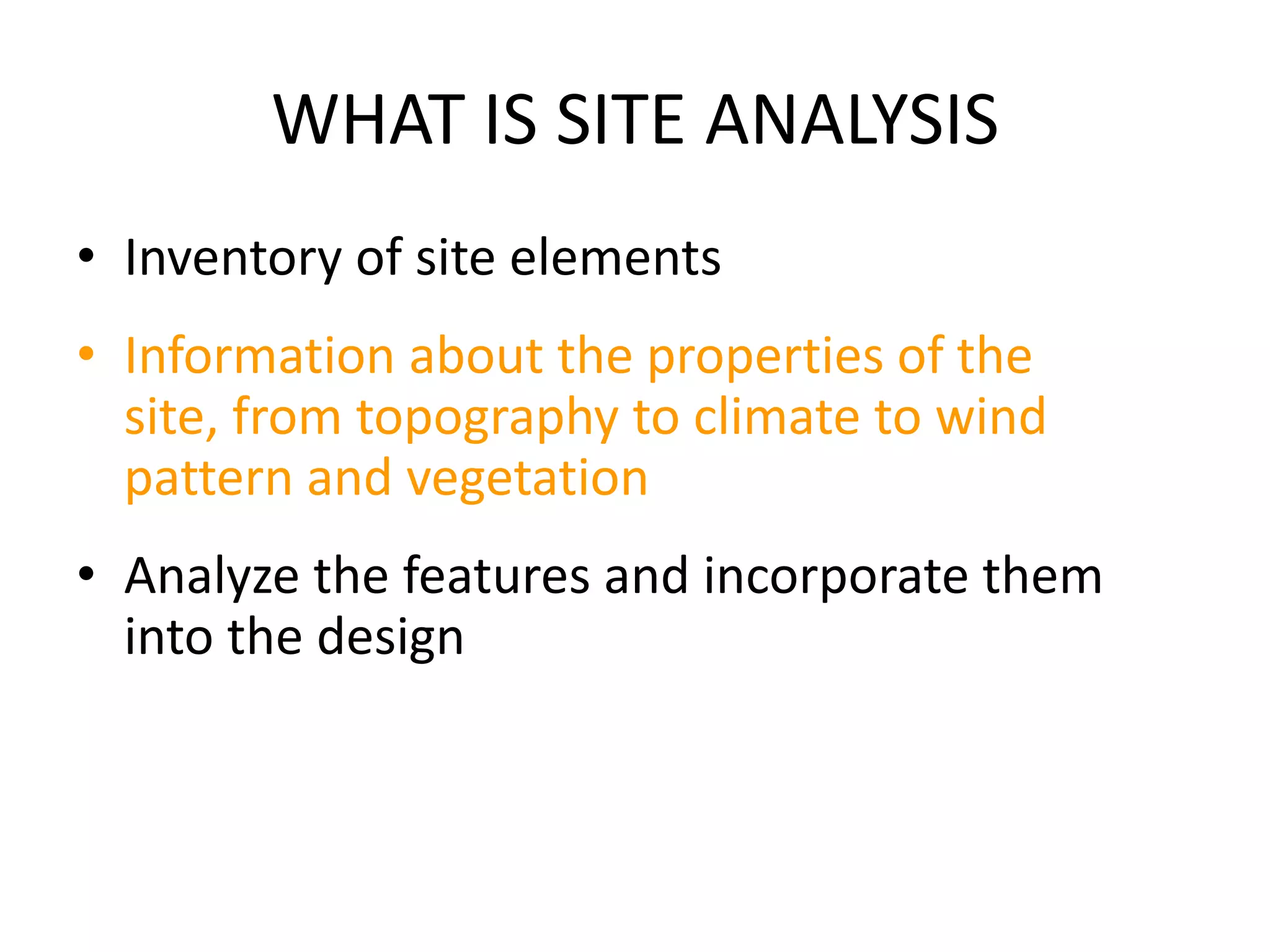 This document discusses the key elements of site analysis, including location, orientation, topography, soil conditions, vegetation, precipitation, hydrology, facilities, site context, views, and locally available resources. Conducting a thorough site analysis provides important information to incorporate site features into building design and placement.