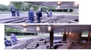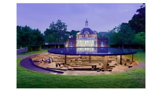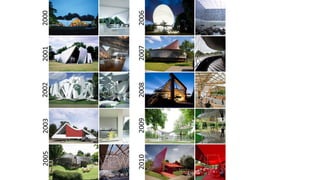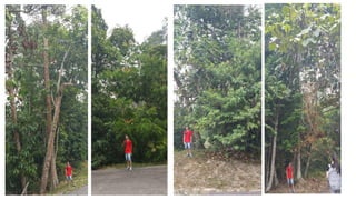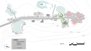 This document provides information on the landscape and existing structures at Taman Botani Negara Shah Alam. It includes descriptions of various plant and tree species found in the park as well as characteristics of palms, bamboos, and other trees. Diagrams and details are given for existing structures like a hut, signboard, private building, compost station, bridge, and gazebo. Analyses address the opportunities and constraints of different areas. Climatic studies examine sun path, light intensity, shaded areas, and annual wind distribution. In summary, the document outlines the landscape and performs site analyses of the botanical garden to understand how to best utilize and maintain its existing features.