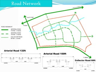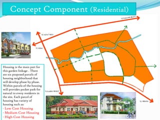 This document provides an analysis of a proposed development site in Bandar Penawar, Johor, Malaysia. It includes summaries of the site conditions, surrounding land uses, accessibility, and development potential. A concept plan is proposed with clustered residential neighborhoods integrated with commercial areas and recreational parks. The overall theme is "Cluster Garden Living" to promote a balanced living environment that is safe, high quality, integrated with nature, vibrant, and convenient.