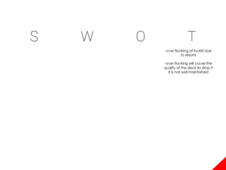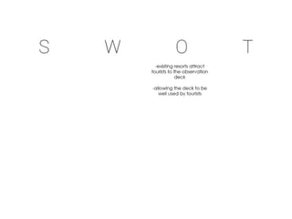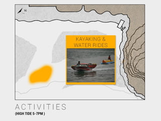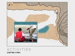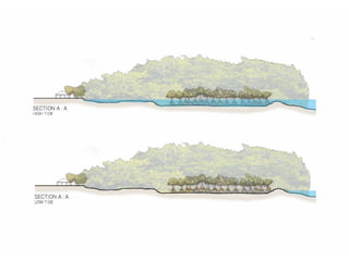 This document provides a site analysis for a coastal area. It includes sections on existing structures, landscape features, climate studies, views and vistas, circulation patterns, and proposed activities. Plans and diagrams show the location, contours, vegetation, and tide patterns. Climate data presents sunlight, wind, rainfall, and temperature information. Soil conditions and their implications are also examined.