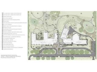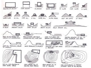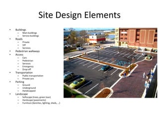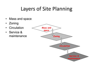 Site planning involves organizing land to accommodate a development program efficiently while expressing the character of the site. It considers elements like buildings, roads, walkways, transportation, parking, and landscape features. An important part of site planning is conducting a site analysis, which evaluates the environmental, program, and development constraints and opportunities of a site to inform a rational design approach. A well-executed site analysis lays the foundation for a cost-effective and environmentally sensitive project.