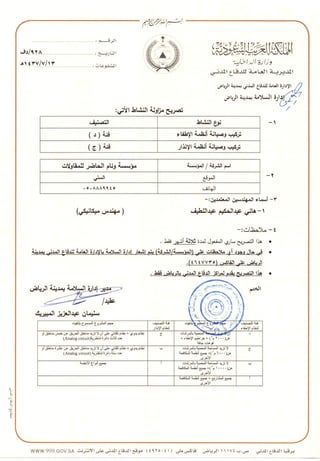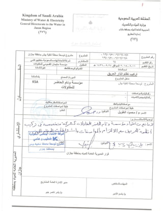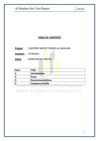 Weam AL-Hader Contracting Establishment provides a summary of a project report for the Eastern Water Tower in Al Khobar, Saudi Arabia. The document includes an introduction to the project, facts about the existing firefighting and alarm systems, and recommendations. It finds that while the overall structures and components are in good condition, the firefighting systems are incomplete and not properly isolated. It recommends completing all life safety systems, ensuring independent water sources, and replacing outdated gas suppression systems.