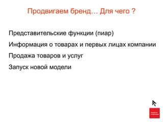 Документ охватывает стратегии комплексного продвижения брендов в интернете, включая различные виды интернет-рекламы и представительские функции. Упоминаются задачи и пути решения для повышения видимости товаров и услуг, а также управление репутацией в интернете и анализ отзывов. Рассматриваются методы работы с негативными откликами и создание позитивного имиджа через PR-акции и мониторинг мнений в социальных медиа.