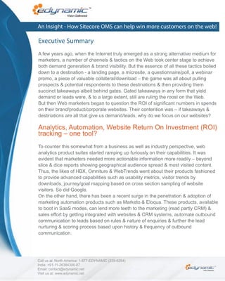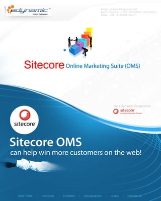 The document discusses how the Sitecore Online Marketing Suite (OMS) can help companies win more customers on the web. It combines web analytics, marketing automation, and return on investment tracking into a single tool. The OMS provides visitor experience analytics, real-time personalization, insights into campaign results, and enables sales teams with information on website prospects. It aims to help companies better leverage their websites and digital channels to measure marketing ROI. The OMS has the potential to change how companies approach web marketing by compelling them to make more use of their own online content and channels.