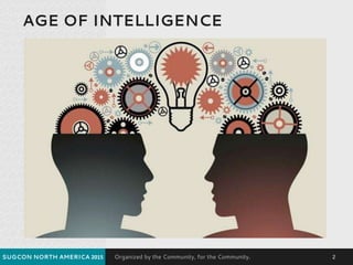 The document outlines various themes and topics discussed at the Sugcon North America 2015 conference, focusing on machine learning, intelligence, and personalized experiences in web development. It emphasizes community organization and participation in exploring automation, intelligent website creation, and diverse content strategies. Notable topics include informed decision-making, intelligent automation, and statistics related to user engagement.