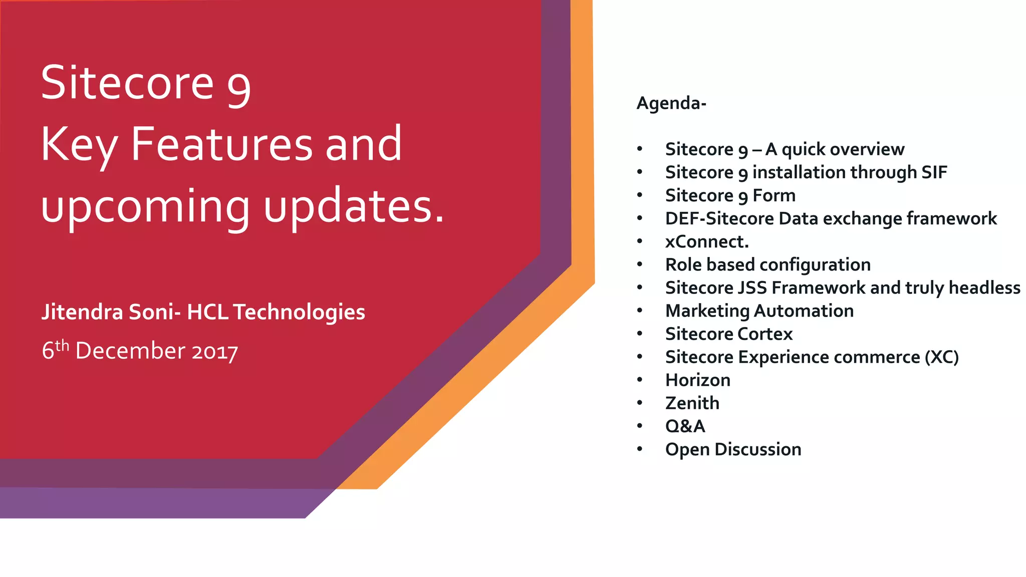 Sitecore 9 key features and upcoming updates were presented. The presentation included: