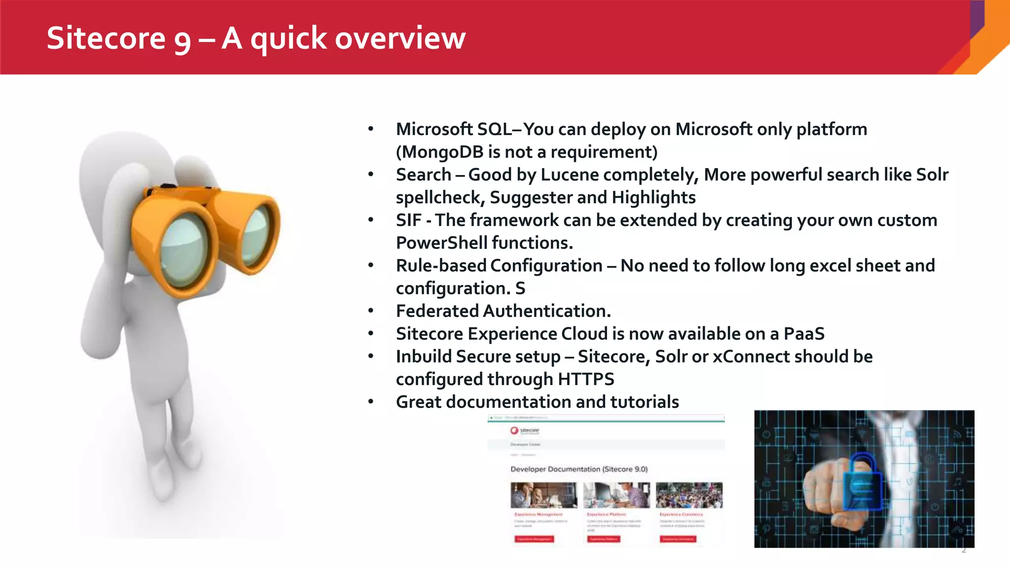 - An overview of Sitecore 9 features like using Microsoft SQL, improved search, and rule-based configuration.
