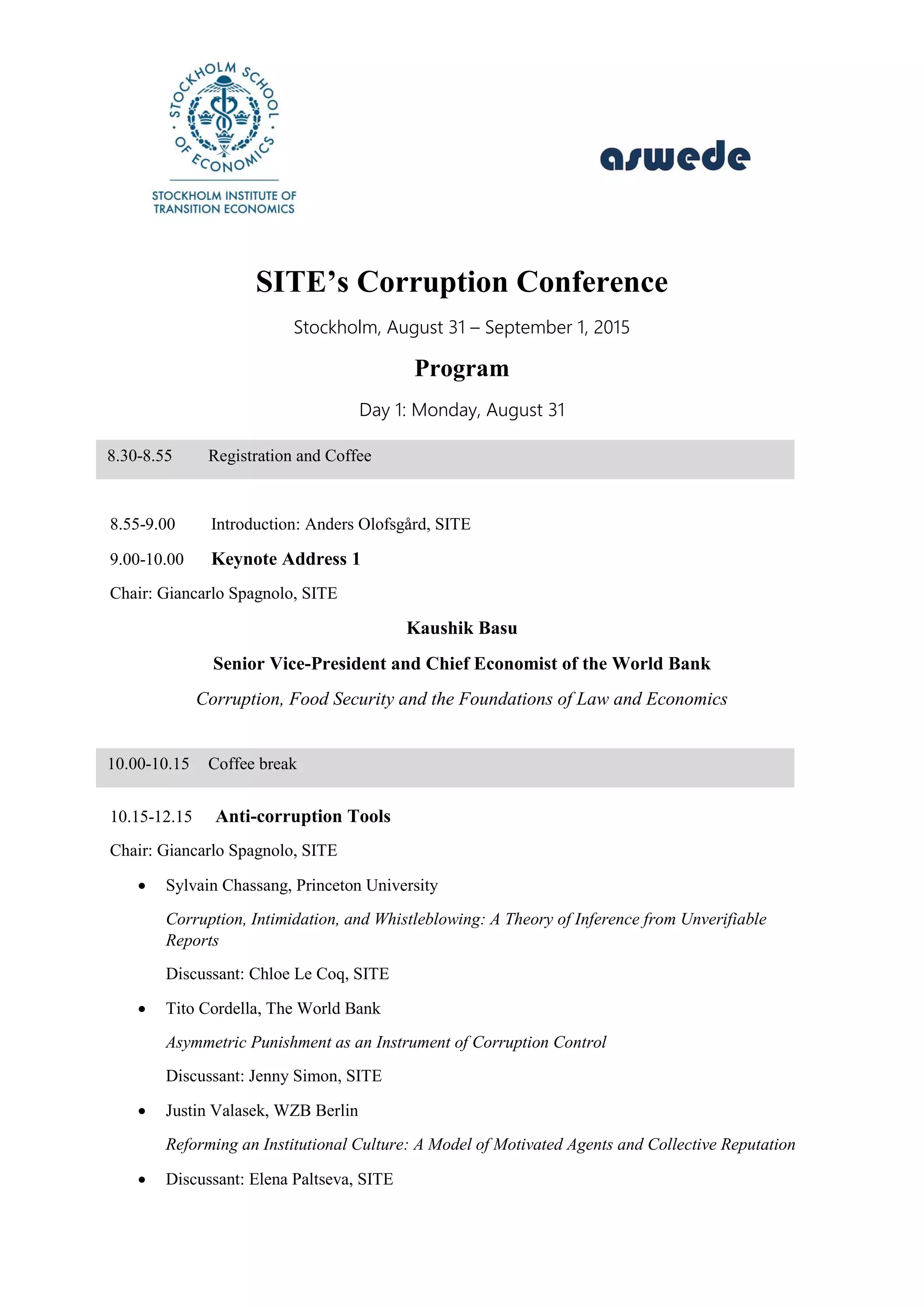 The document outlines the agenda for the site's corruption conference held in Stockholm from August 31 to September 1, 2015. It includes keynote addresses, various sessions focusing on anti-corruption tools, corruption in transition and developing countries, and a policy panel. Notable participants include economists from prestigious institutions discussing the relationship between corruption, governance, and policy responses.