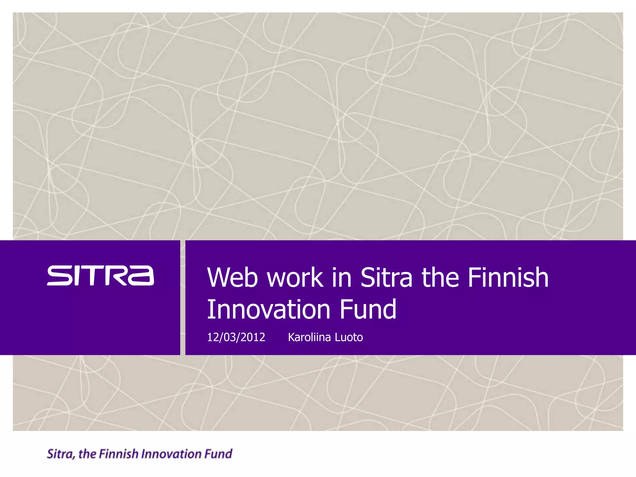 Sitra is an independent public fund in Finland that is guided by the Finnish Parliament. It has a mission to reformulate thinking around well-being, search for sustainable solutions, and enable sustainable business. Sitra takes a subject-based approach to its web presence rather than being organization-centered. It uses a variety of community tools like Facebook, Twitter, and LinkedIn to engage in dialogue around its projects and initiatives. These tools help facilitate discussion, share ideas and information, and involve both citizens and experts. Sitra coordinates its various online presences and activities through communication professionals and sometimes outsources facilitation of larger initiatives.