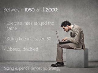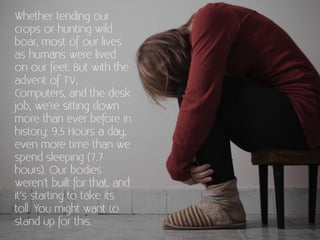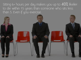 Sitting for long periods of time can negatively impact health. Research shows that each additional hour of TV watched per day correlates to an 11% higher risk of death. The document encourages reducing sitting time and becoming more active to improve well-being.