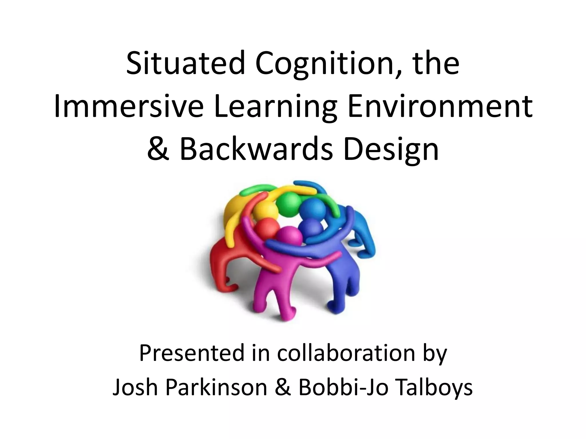 This document discusses situated cognition theory, immersive learning environments, and backward design. [1] Situated cognition proposes that learning occurs through authentic activities and tools within communities of practice. [2] An immersive learning environment embeds learning in relevant contexts to foster active, social, and experiential learning. [3] Backward design, created by Wiggins and McTighe, involves defining learning goals and assessments before planning instruction so that lessons help students achieve deep understanding.