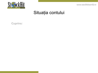 Documentul oferă o descriere detaliată a modulelor disponibile pe platforma Stockhit World, inclusiv informații despre conturi, rapoarte și funcționalitățile acestora. Se evidențiază diverse rapoarte, cum ar fi account overview, trades executed, account statement și trading conditions, care furnizează utilizatorilor informații esențiale despre activitatea de tranzacționare, soldurile contului și condițiile de tranzacționare. De asemenea, se menționează riscurile asociate cu investițiile în instrumente financiare și importanța unei evaluări atente a situației financiare înainte de a efectua tranzacții.