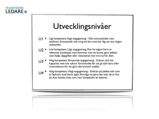 #3 Varje ledarstil är direkt kopplat till medarbetarens utvecklingsnivå. En medarbetare som stäls inför en helt ny uppgift har oftast då relativt låg kompetens och behöver då en instruerande ledare för att känna sig säker och trygg. Medarbetarens En medarbetare som befinner sig på U2 där... behöver då en ledare som entusiasmerar och övertygar en för att stärka engagemanget och övertyga medarbetaren att dens kunskap faktiskt räcker till.