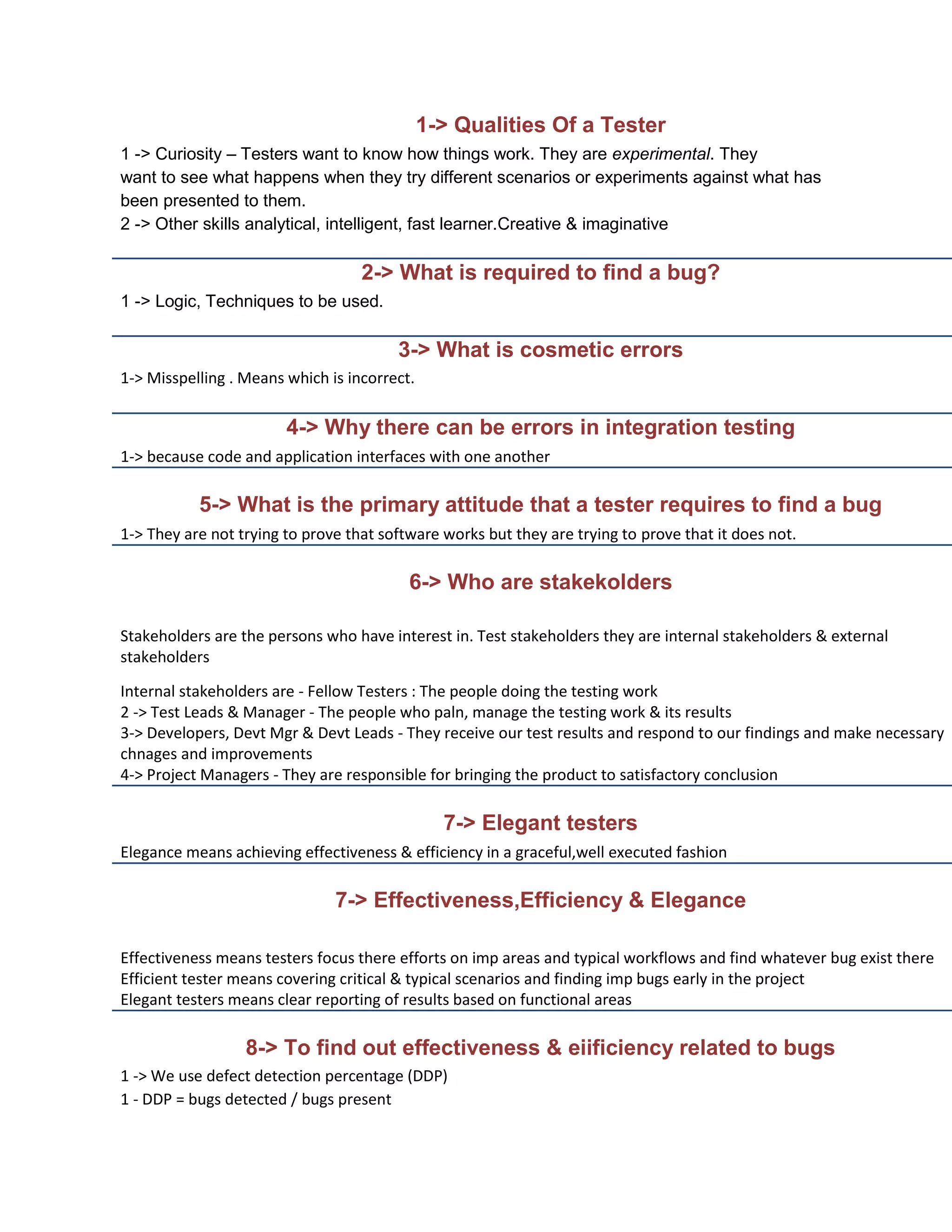 1. Qualities of a good tester include curiosity and being analytical. Other skills include being a fast learner and creative.