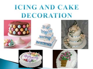 This document provides information on different types of cake icings and their uses. It discusses the main functions of cake icing, which are to decorate cakes, hold together overall cake designs, and help prolong the freshness of cakes. It then describes various icing types like fondant, buttercream, foam icings, and glazes. It provides guidelines for using different icings and discusses potential cake problems, causes, and solutions.