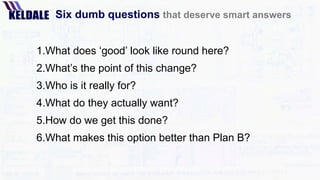 The document outlines six critical questions that aim to guide effective change management: defining what 'good' looks like, understanding the purpose of change, identifying the true beneficiaries, clarifying stakeholders' wants, outlining execution strategies, and comparing options for resource allocation. Each question emphasizes the need for clarity and measurable impact in decision-making processes. The emphasis is on ensuring all stakeholders are aligned and that changes are genuinely beneficial.
