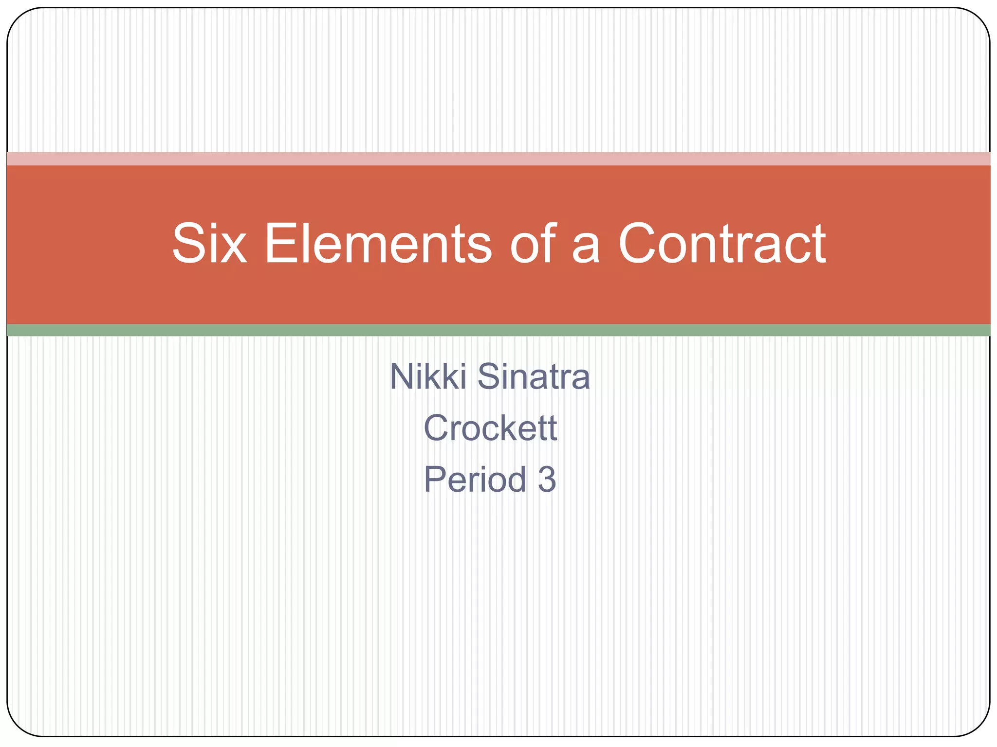 This document summarizes the six elements of a valid contract: 1) offer, which is a proposal made with serious intent by an offeror to an offeree; 2) acceptance, which is an unqualified agreement to the offer's terms without modification; 3) genuine agreement between the parties to create a final contract; 4) consideration, which is the exchange of benefits and detriments by the parties; 5) contractual capacity of the parties to enter into an agreement; and 6) legality in accordance with civil and criminal law as well as public policy.